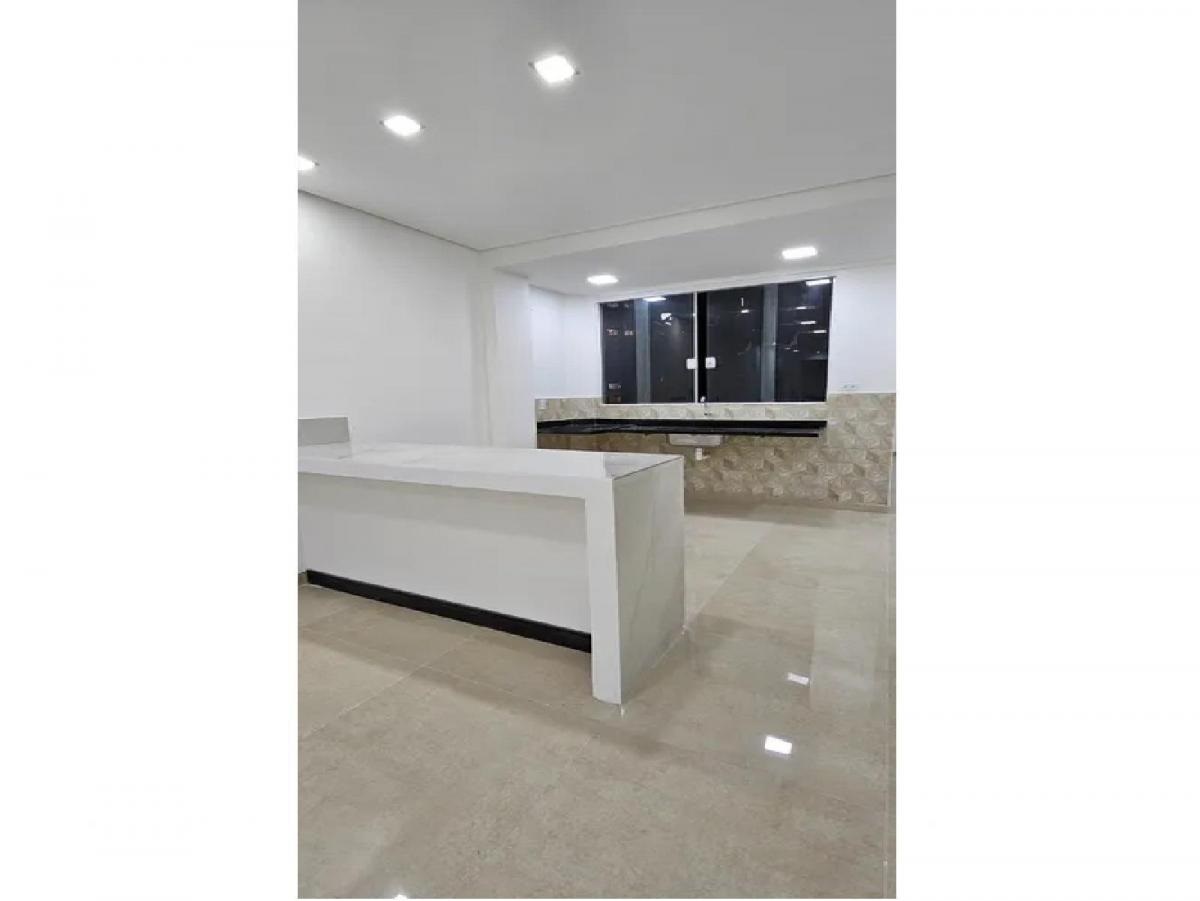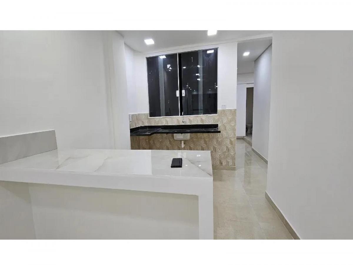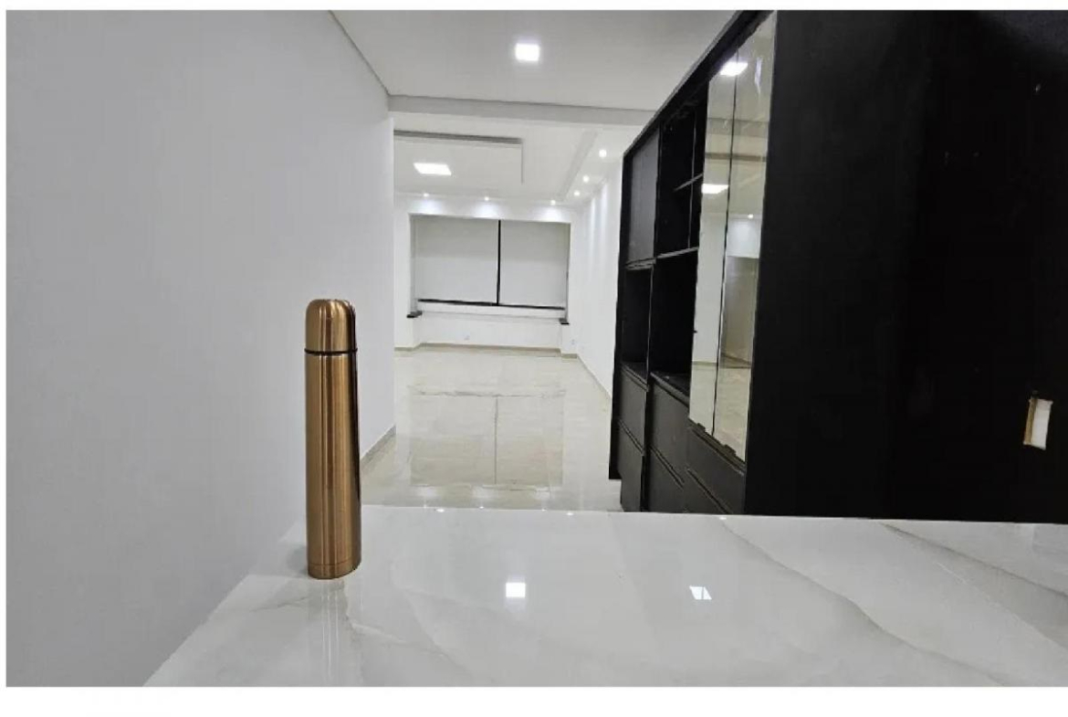 Sala ampla e cozinha com balcão, com acabamentos que parecem novos.