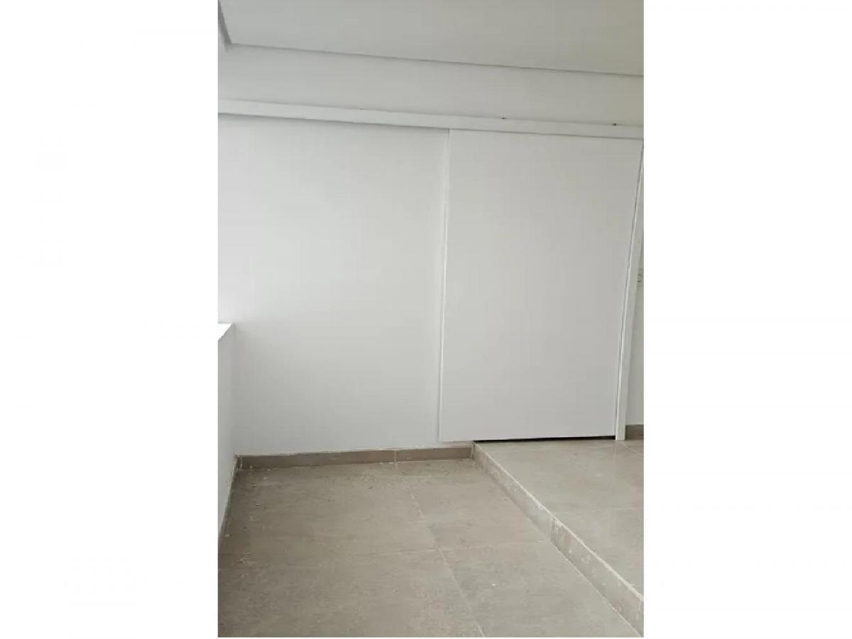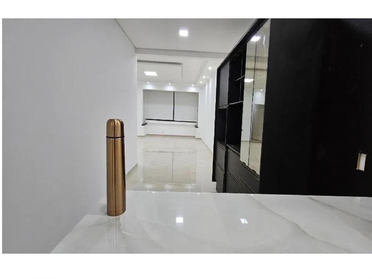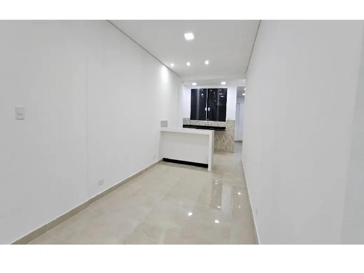 Sala ampla e cozinha com balcão, com acabamentos que parecem novos.